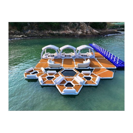 Nous avons lancé une gamme de plateformes de loisirs gonflables flottantes, comme ce bar aquatique et ce salon flottant. Celle que nous présentons aujourd'hui est une grande île flottante complète, spécialement conçue pour les loisirs en eau libre. Cette grande île flottante intégrée est conçue avec quais pour jet ski , une variété de différents salons flottants et bars à eau , piscines de mer et canapés-lits gonflables. Cette plateforme multifonctionnelle permet de pratiquer diverses activités nautiques. Vous pourrez par exemple bronzer, lire, discuter, nager, etc.